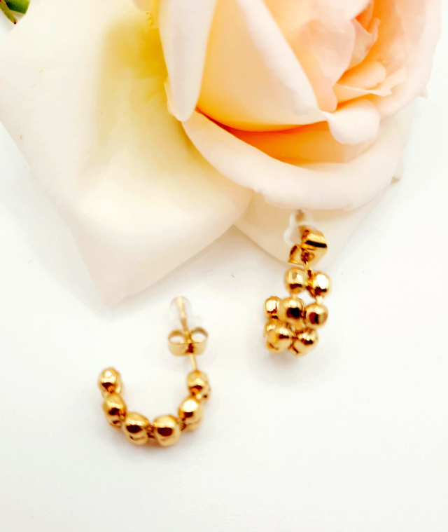 L'élégance minimaliste aux reflets solaires. Sublimez votre visage avec ces demi-créoles au design audacieux et contemporain. Composées d'une succession de petites billes dorées, ces boucles d'oreilles créent un effet de texture "bulles" unique qui apporte immédiatement du relief et de la modernité à votre style.
