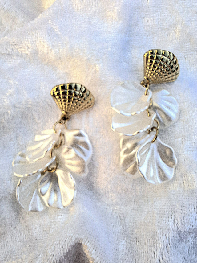 2. Design Poétique : Le contraste entre le doré texturé du coquillage et la douceur des pétales blancs apporte une touche de lumière immédiate au visage.