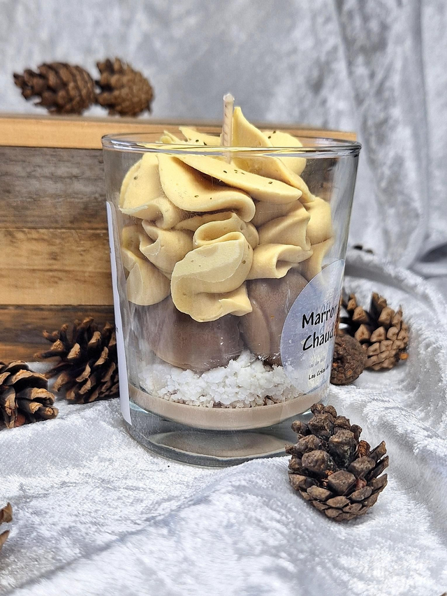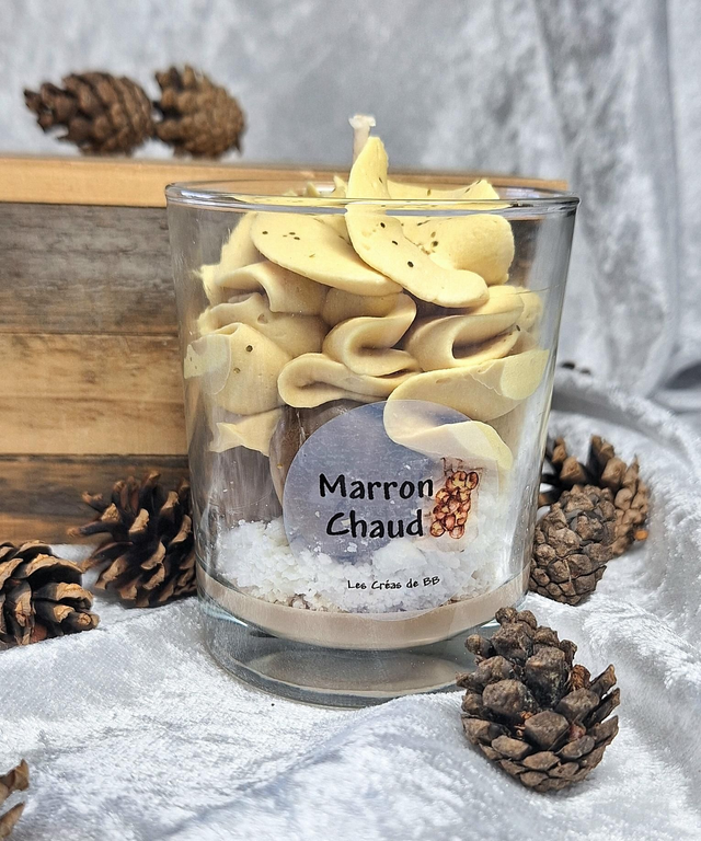 Retrouvez le réconfort des soirées au coin du feu avec cette bougie signée "Les créas de BB". Imitant a la perfection un dessert onctueux au marrons, elle apporte une touche visuelle et olfactive a votre intérieur.