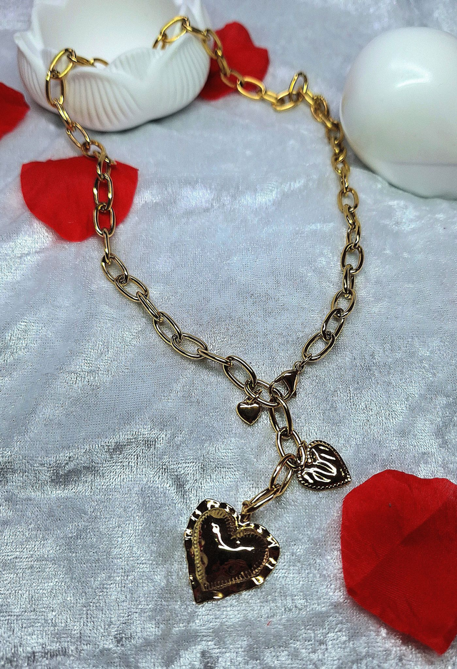 L'élégance romantique au fini martelé. Affirmez votre style avec ce collier "Triple Cœur", une pièce de caractère qui marie modernité et charme vintage. Conçu en acier inoxydable doré de haute qualité, ce bijou est conçu pour durer : il résiste à l’eau, ne ternit pas et reste hypoallergénique pour un confort quotidien.