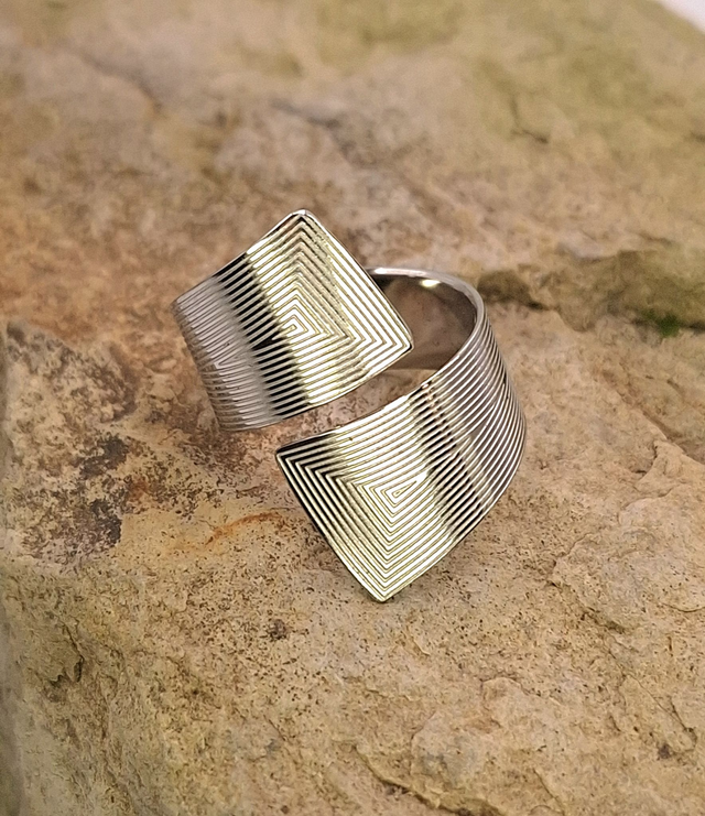 Ses deux extrémités carrées se rejoignent dans un mouvement croisé dynamique. Le travail de gravure en lignes concentriques crée un relief hypnotique qui joue avec la lumière a chaque mouvement de main.