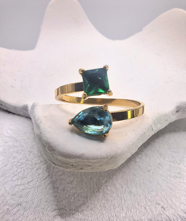 Contraste raffiné:L'éclat profond d'un cristal vert émeraude a la coupe carrée rencontre la douceur cristalline d'une goutte bleu azur. Un dialogue de couleur inspiré des nuances de l'océan.