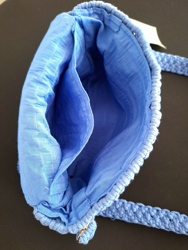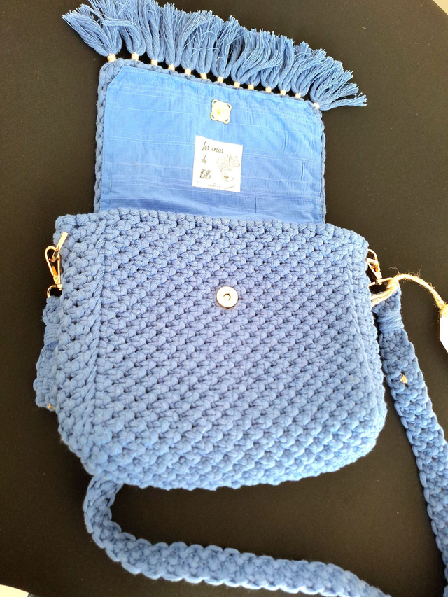 Magnifique sac en macramé couleur bleu jeans ,petites franges sur le devant, fermeture par bouton aimanté, bandoulière amovible, intérieur doublé,