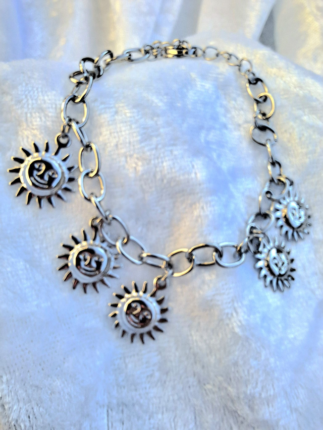 Ce bracelet argenté est orné se charmantes breloques en forme de soleil aux visages souriants. Il apporte une touche de gaieté et de lumière a votre poignet.