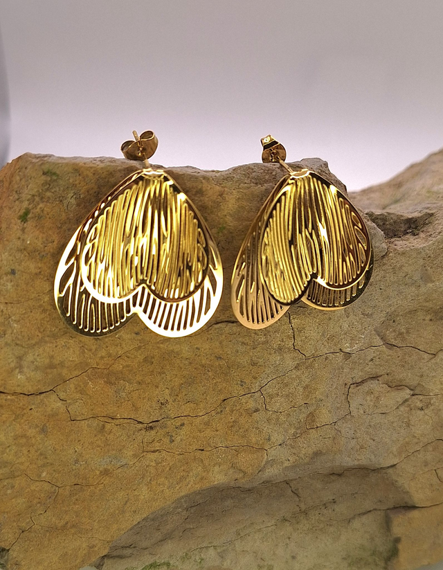 Boucles d'oreilles dorées, cœurs superposés ajourés.