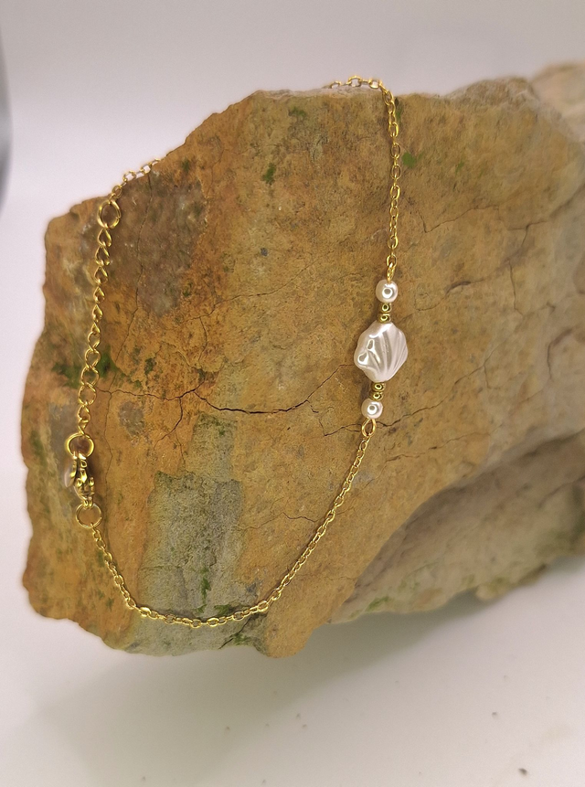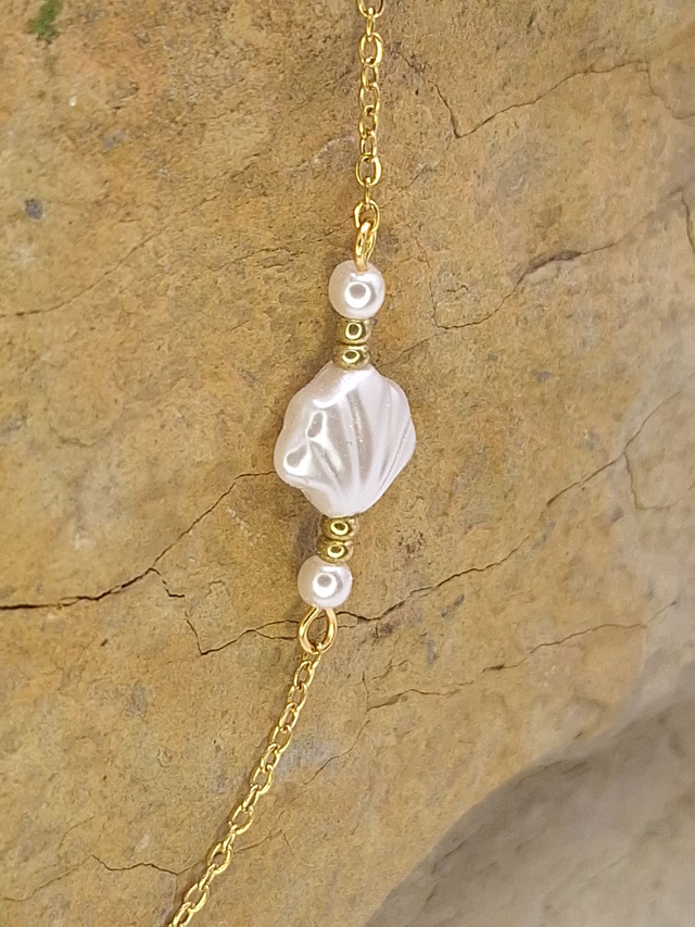 Bracelet fine chainette rehaussé d'une jolie perle blanche en forme de coquillage.