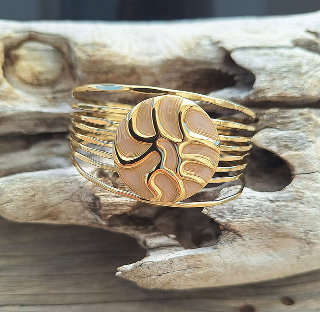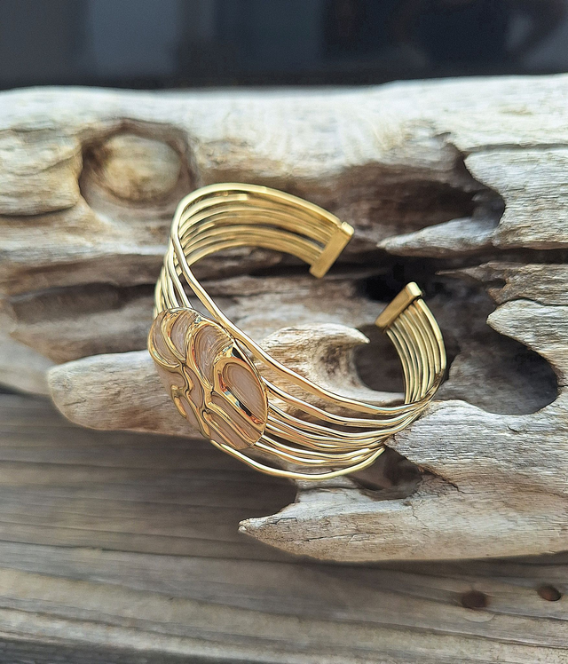Ce bracelet manchette doré se distingue par son design multi rangs. Il est composé de de plusieurs fins anneaux superposés qui s'unissent a chaque extrémité. Au centre, un médaillon émaillé ivoire apporte une touche d'élégance et de finesse a ce bijou contemporain.