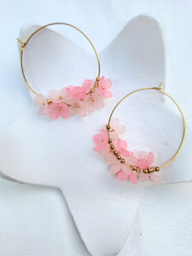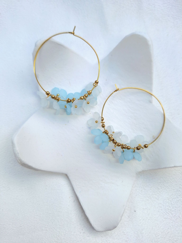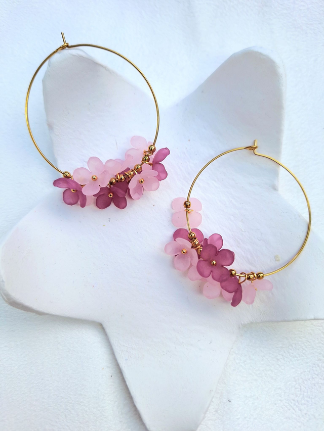 Fines créoles dorées, perles métal et petites fleurs en résine mauve ,bleu azur et rose pastel.