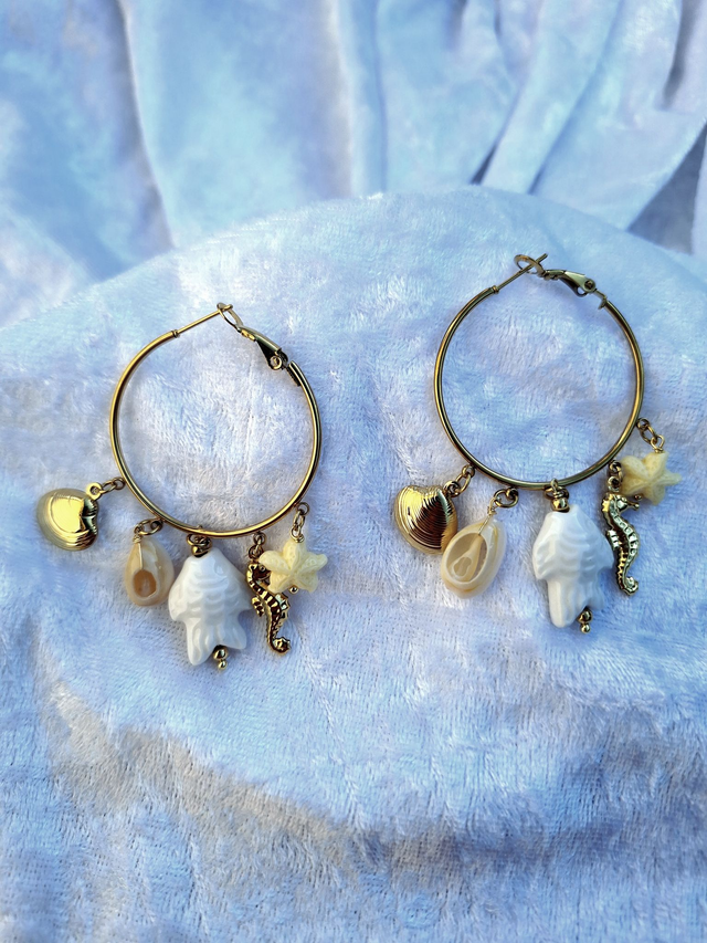 Évadez-vous en bord de mer avec les créoles "Océan". Véritable ode à la vie marine, ces boucles d'oreilles créoles dorées en acier inoxydable capturent l'esprit des vacances et la douceur du sable fin. Chaque créole est ornée de délicates breloques suspendues, créant un mouvement fluide et un tintement léger à chacun de vos pas.