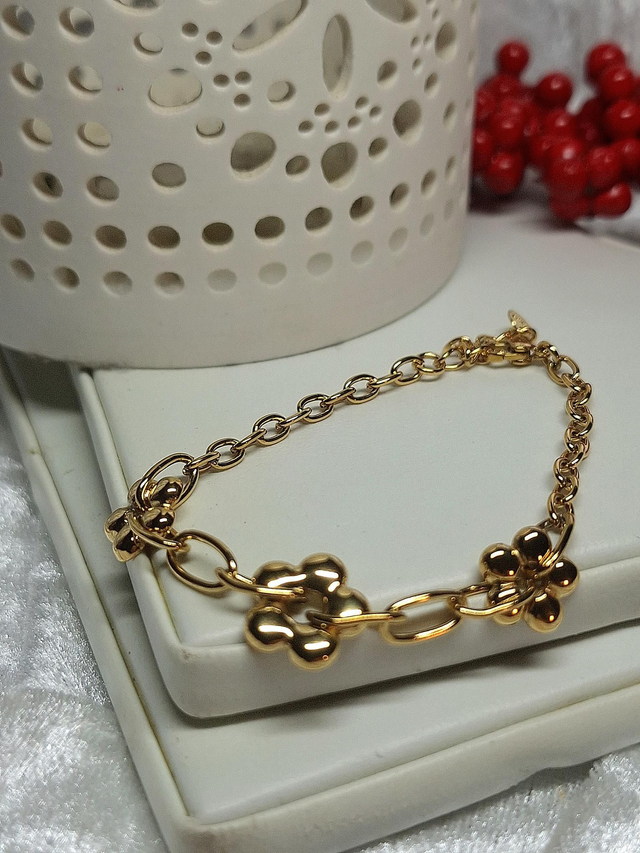 Bracelet doré chaine grosses mailles avec trois petites fleurs.